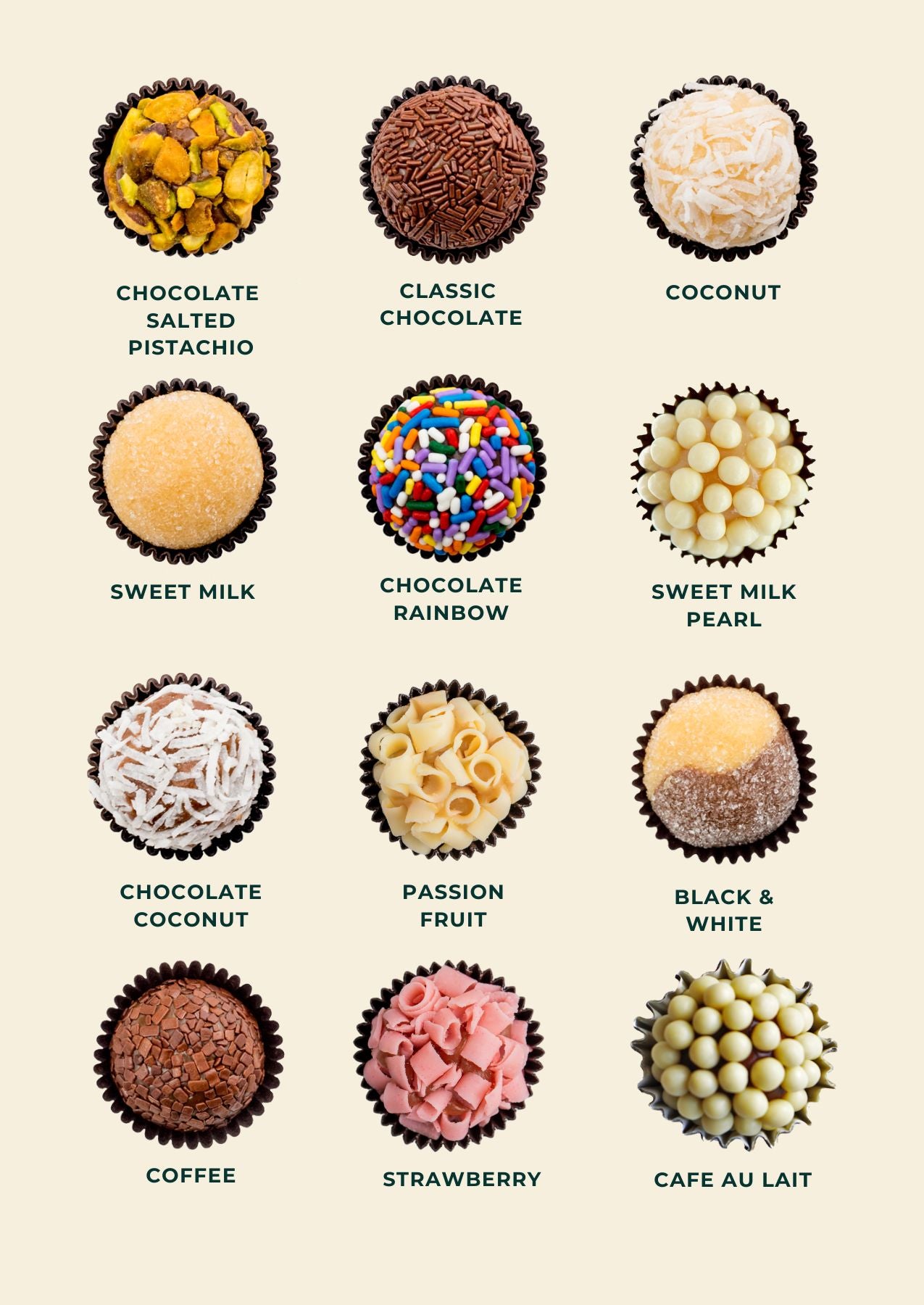 All of our Brigadeiro start with a base of whole milk, sugar and butter. Natural ingredients are then added, such as cocoa powder, coconut, fruit purees and coffee . All flavors are gluten-free, except Sweet Milk Pearl and Café Au Lait, which include a crunchy white chocolate pearl containing wheat. Nuts are only present in flavors with nut coatings. We pride ourselves on making everything from scratch with the highest quality ingredients, please contact us if we can answer anymore specific questions.