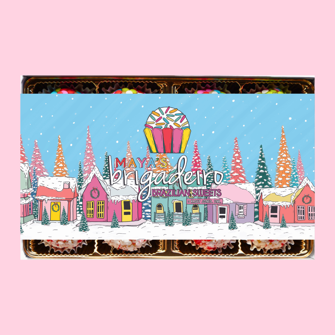 We've partnered with our favorite local artist Kasey of Kasey Jones, Ink. to create a limited-time holiday gift box. Each box contains curated flavor assortment of hand-rolled Brigadeiros and a playful seasonal display sleeve inspired by the candy-colored vintage houses that aligned Kasey's Christmas trees growing up.