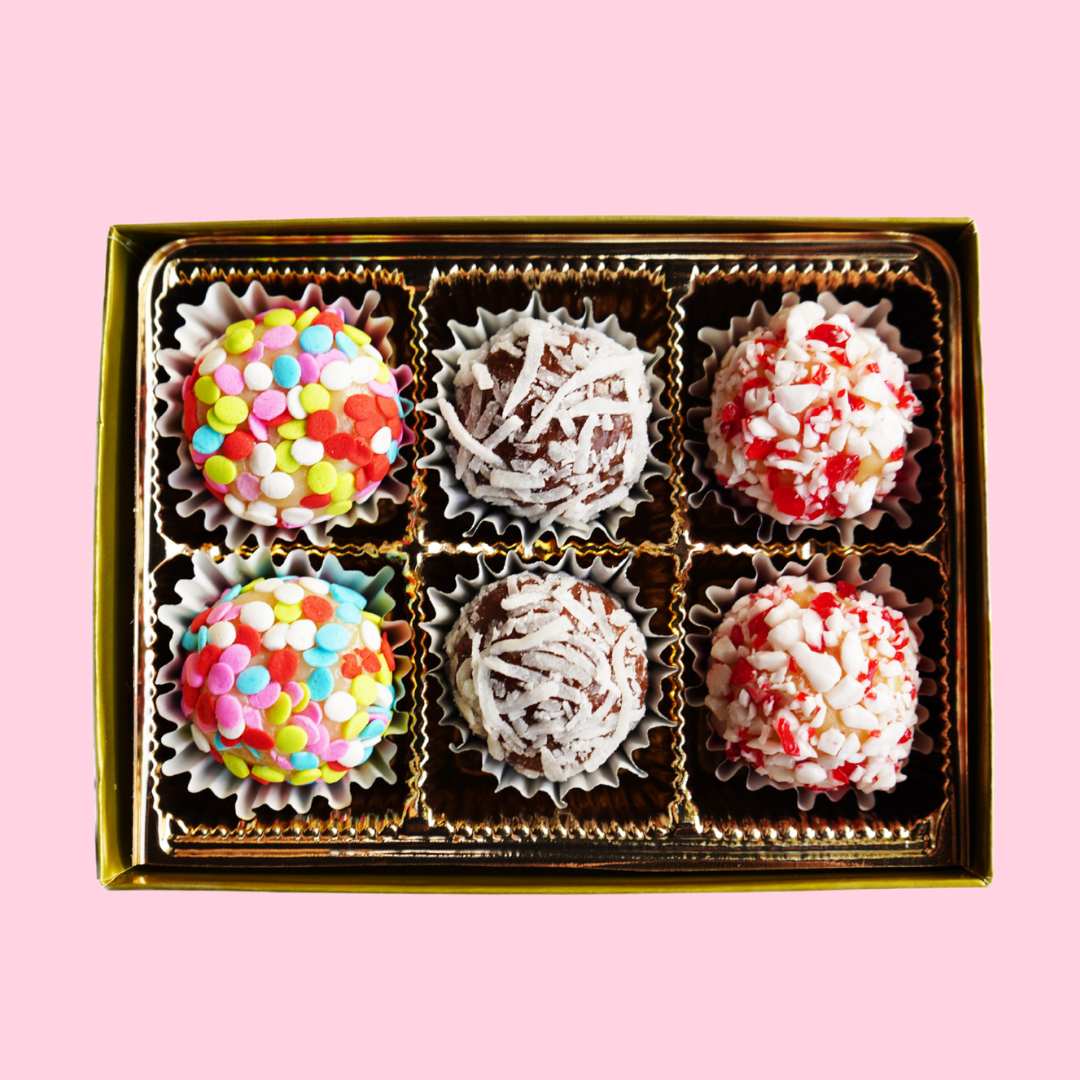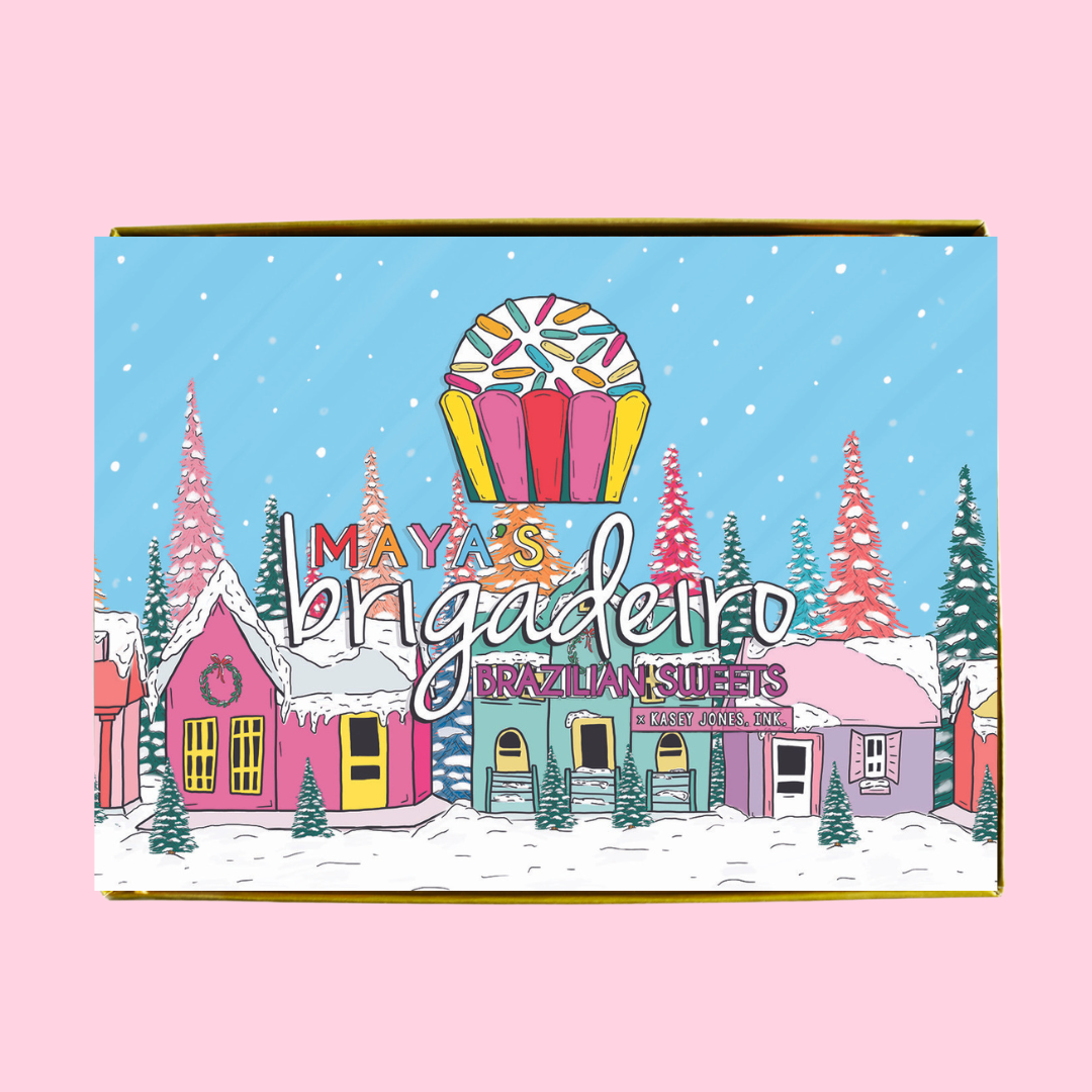 We've partnered with our favorite local artist Kasey of Kasey Jones, Ink. to create a limited-time holiday gift box. Each box contains curated flavor assortment of hand-rolled Brigadeiros and a playful seasonal display sleeve inspired by the candy-colored vintage houses that aligned Kasey's Christmas trees growing up.
