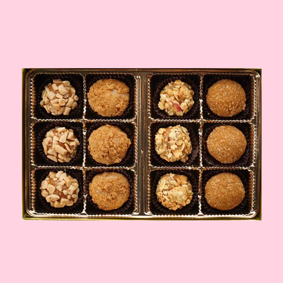 Salted Caramel: Rich and sweet caramel Brigadeiro sprinkled with a kick of Sea Salt and rolled in crunchy toffee bits.